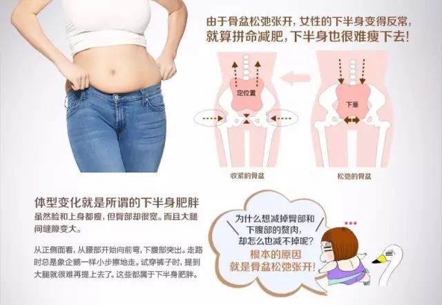 但由于骨盆松弛,产后妈妈就会出现要腰、两侧髋骨,尾椎疼痛以及其他内脏疾病。骨盆变形会使下半身的血液循环以及新陈代谢变慢变差,这时下半身很容易堆积赘肉,腰部松垮臀部变大,还会引发多种妇科疾病。