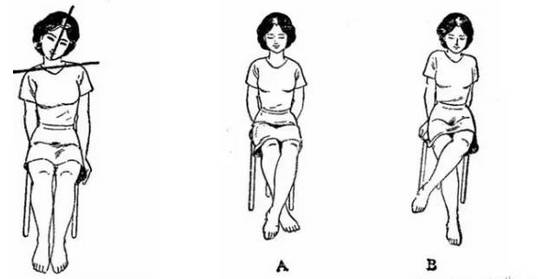 7、测量膝盖到地板的距离,右侧高于左侧表示右侧骨盆朝右上歪斜,反之则朝左上歪。