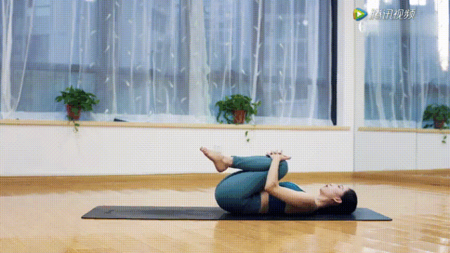 首先让整个身体平躺在垫子上,双脚并拢,双手放在膝盖窝处,慢慢的拱背向下,让腰椎的位置完全贴靠在垫子上。