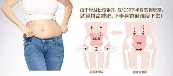 由于骨盆支撑着上半身,所以骨盆一松弛,要通过臂大肌和臂中肌这类臀部上的肌肉以及腰部的肌肉来支撑,导致体形走样,并容易发生腰痛以及肩酸等现象。甚至不能给脚上施出均等的力,严重的情况下,会造成步行障碍。另外,容易发生内脏,子宫下垂,严重的情况还会发生子宫脱垂。而且由于生产的原因,不光是骨盆,肌肉也会变得松弛,容易发生小便失禁。