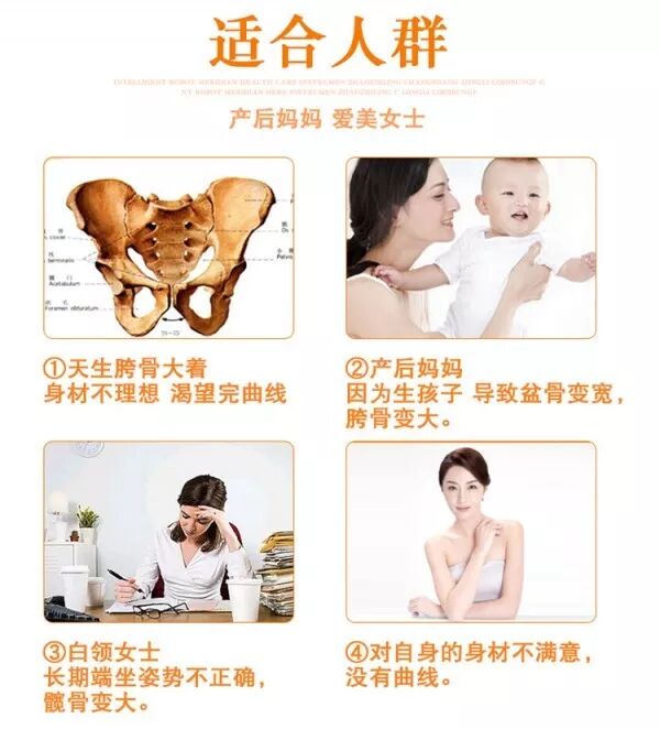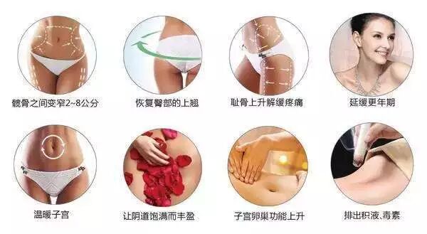 快速恢复骨盆,使被撑大的骨盆、分离的耻骨和受损的韧带得以恢复; 修复体型变化,有效恢复产后变宽的胯骨,扁平下垂的臀部及大象腿; 可预防妇科疾病,修复松弛的盆底肌,预防尿频失禁,甚至有可能的子宫下垂。