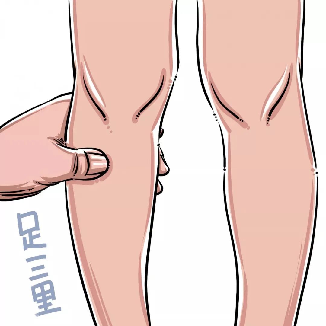 足三里是胃经上的保健大穴,《灵枢》有“邪在脾胃......皆调于足三里”。足三里位于外膝眼(犊鼻穴)下3寸,胫骨前嵴旁开1横指(中指)。它用拇指端按揉之,称为揉足三里。