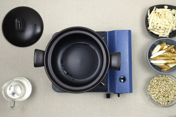 ③放入白玉菇,添加少许盐和生抽,上盖继续小火熬制 10 分钟左右即可关火。