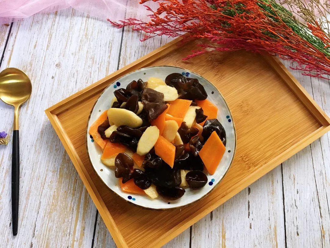 ④锅里倒入适量食用油烧热,放入胡萝卜片翻炒片刻,再倒入山药片、木耳翻炒均匀。