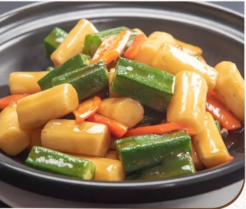 ③锅底留少许油,放入素蚝油、酱油、十三香、磨菇精,倒入山药,小火焖5分钟,倒入秋葵、红椒,大火收汁勾薄芡淋上香油,即可出锅装入砂煲