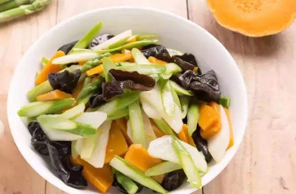 ①山药、南瓜去皮切片,芦笋切成滚刀状,木耳泡发洗净撕成大片,依次放入锅中焯水后盛入盘子中备用;