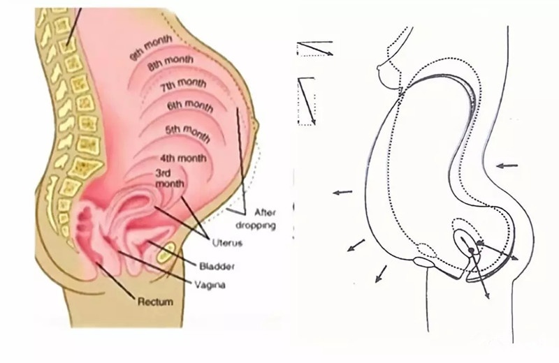 一部分女性,认为怀孕和生产其实是一个自然的过程,或者自己没有漏尿等症状,就不需要训练盆底肌。如果你对训练盆底肌的必要性还存在疑问,那么你一定要认真的看完这篇文章。因为很多妈妈,都是在生完宝宝之后不注意盆底肌的康复而导致症状加重的。 盆底肌的损伤是不能自行恢复的,有些妈妈可能还会因为各种原因而加重。所以,每一位产后妈妈,都应该严肃认真地对待你的盆底肌! 诸多的资料表明怀孕和自然生产均是盆底肌损伤的危险因素。很多盆底肌损伤是在孕期就造成了,很多妈妈在孕中后期可能就出现了漏尿等症状。 我们来看一下原因。下图中我们可以看到,随着孕期宝宝体重的增加,盆底肌的压力越来越大,腹腔压力的重力线向盆底肌偏移(虚线是正常情况下,实线是怀孕时)。