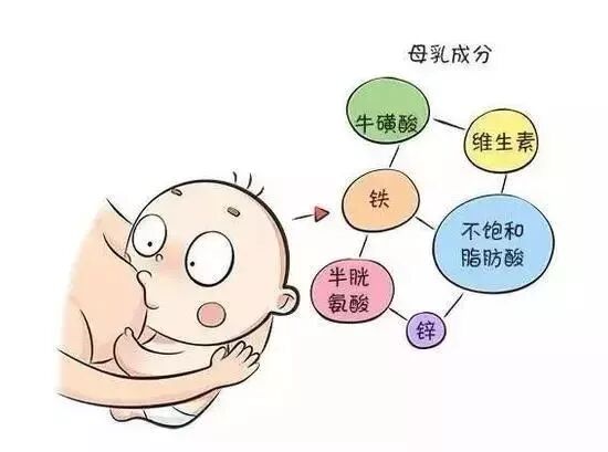 母乳内含有乳铁蛋白、碳水化合物、蛋白质、脂肪、维生素、矿物质、脂肪酸和牛磺酸等;营养丰富、比例适当、易于吸收。