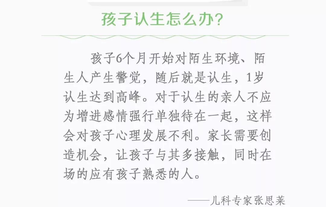 处于认生期的孩子,对陌生人的突然接近会很抵触。所以刚开始时,对于宝宝不熟悉的人可以先保持一个相对较远的距离,熟悉玩耍一段时间,然后再近距离接触。