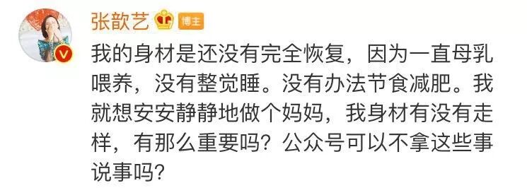 6月24日晚,张歆艺通过微博回应产后身材走样,并呼吁请对一个哺乳妈妈多一些宽容和理解,“我的身材是还没有完全恢复,因为一直母乳喂养,没有整觉睡。没有办法节食减肥。我就想安安静静地做个妈妈”。