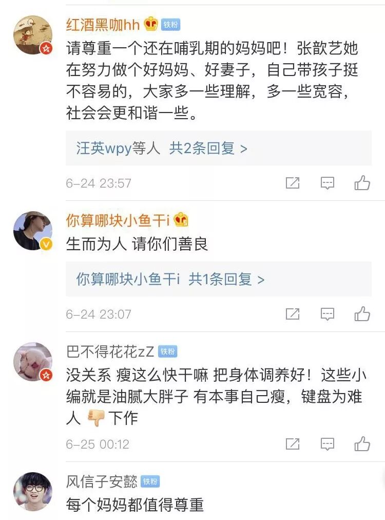 大部分网友都是理智的,纷纷站在张歆艺这一边:请尊重一个还在哺乳期的妈妈吧!自己带孩子挺不容易的,大家多一些理解,多一些宽容,社会会更和谐一些。