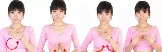 1、环形按摩:双手置于乳房的上、下方,以环形方向按摩整个乳房;