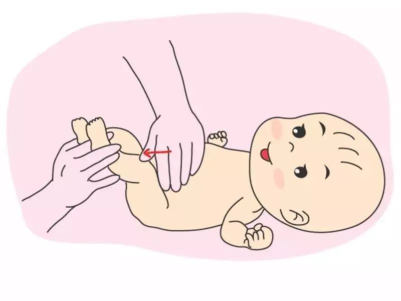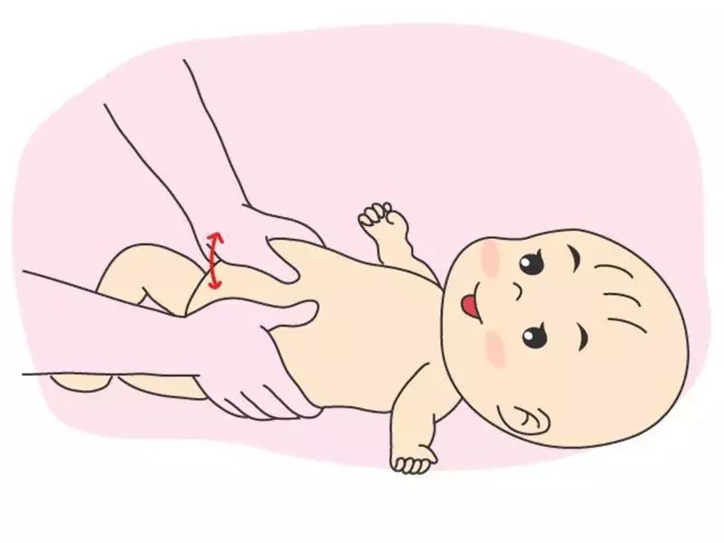 "I"字按摩:右手掌贴放在宝宝的左腹上方,向下滑动至胯下,好像是写出英文字母“I”。