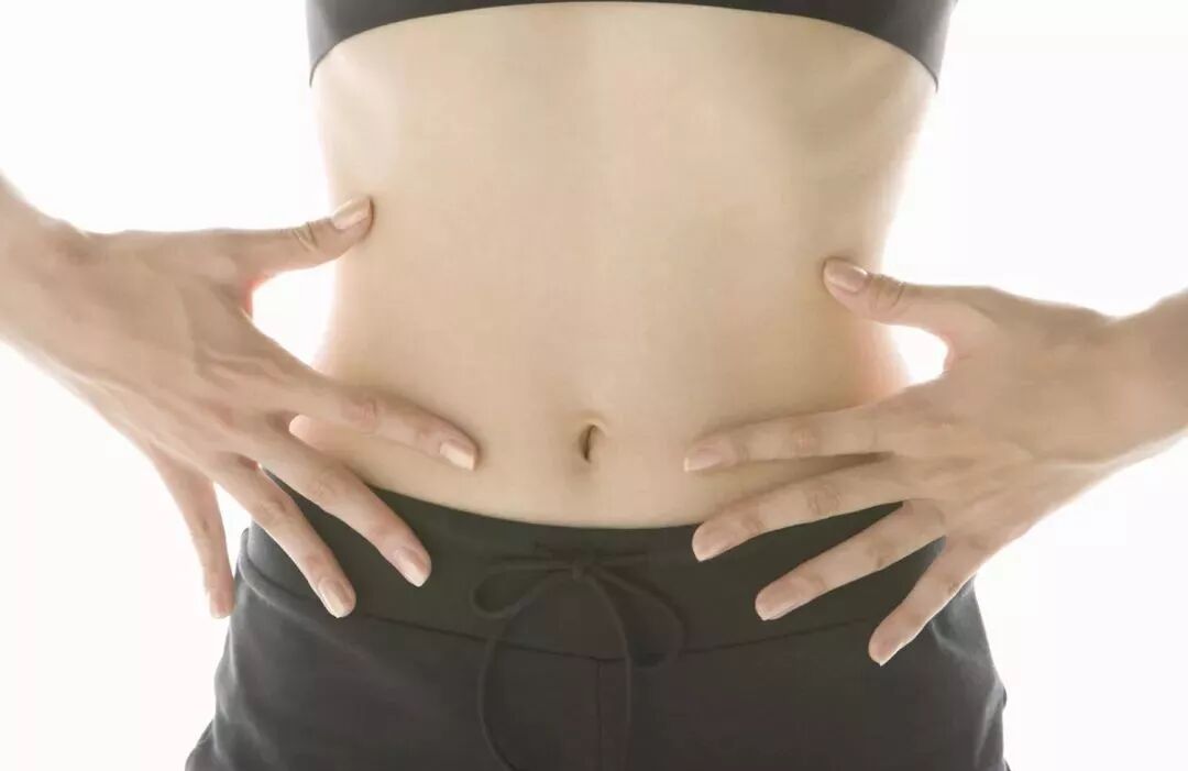 2、将一只手的指尖放在肚脐处,同时放松腹部,轻轻地将指尖伸入腹部。