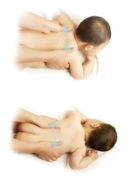 1、双手大拇指平放在宝宝背部脊柱两侧,其他手指并在一起扶住宝宝的身体。拇指指腹分别由中央向两侧抚摸,从肩部处移至尾椎,反复3-4次。