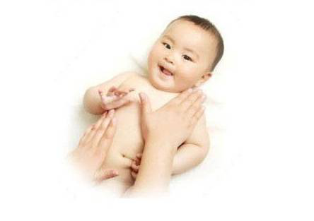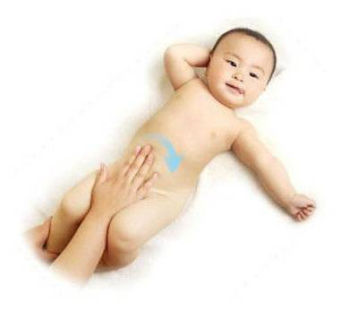 放平手掌,顺时针方向画圆抚摸宝宝的腹部,注意动作要特别轻柔,不要离肚脐太近。