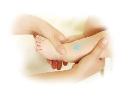 2、用一只手握住脚后跟,另一只手朝外握住宝宝的小腿,沿膝盖向下捏压,滑动至脚踝。