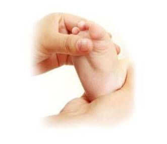 3、一只手抓住脚后跟,另一只手抓住宝宝的脚背,大拇指指肚轻柔脚底,从脚尖抚摸至脚跟,反复3-4次。