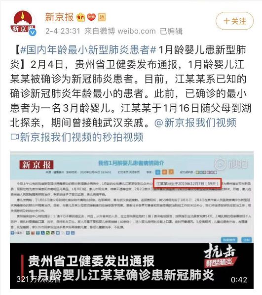 光浙江一个省,截至31日就有8个新型冠状病毒的儿童病例。2月4日贵州省卫健委发布通报:最小的婴幼儿患者,仅1个月。