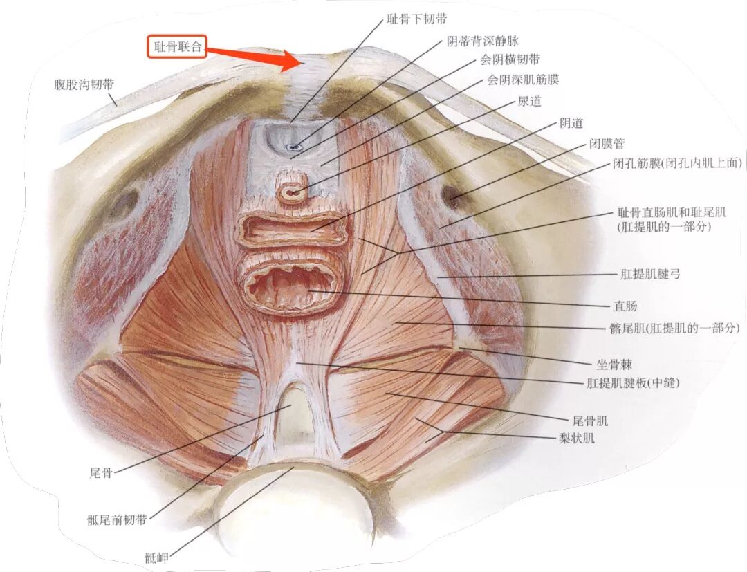 耻骨联合是由两块耻骨纤维软骨盘结合而成,两个软骨盘之间形成一联合腔,其上、下、左、右均有像绳子一样的韧带联系在一起。