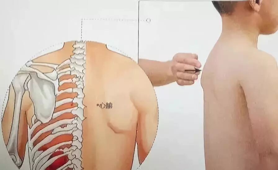 位置:心腧位于第五胸棘突下,左右旁开1.5寸。这个穴位可以这样找,肩胛骨中央的脊柱骨起,左右旁开两横指。