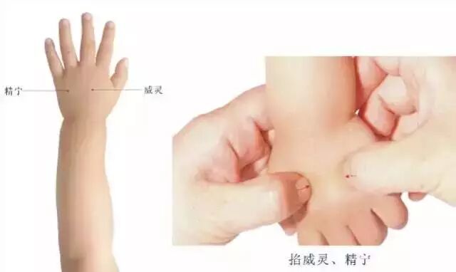 位置:精宁位于手背第四、五掌骨的缝隙间;威灵位于手背第二、三掌骨的缝隙间。这两个穴位可以这样找,先定位下孩子的外劳宫穴,手心正对的就是外劳宫穴,再从外劳宫往两旁数掌骨即可。