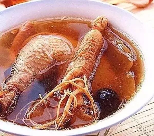 【制法】将人参用清水洗净,切成薄片;母鸡宰后,洗净,剁去爪,放入开水锅中氽透,捞出控去水分;锅内加入猪油烧热,放入葱、姜炒出香味,加入料酒、高汤、盐、味精,待汤开几次之后,拣出葱、姜,倒入砂锅内,再把母鸡及人参放进锅里,用小火炖至肉烂,撇去浮油即可。