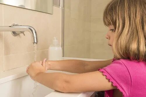 外出回家脱去外衣并换鞋后,第一件事就是认真洗手。在家中,普通肥皂或洗手液都可以,一定要用流动的清水冲洗,并且按照规范步骤洗手,仔细揉搓手上的每个部位。洗手完成后可以清洗面部,如果孩子配合,可以清洗鼻腔和漱口。