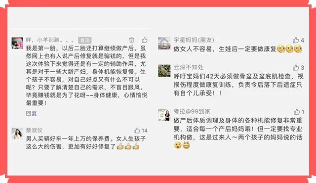 @咩,小羊别跑!:我是第一胎,以后二胎还打算继续做产后。虽然网上也有人说产后修复就是骗钱的,但是我这次体验下来觉得还是有一定的辅助作用,尤其是对于一些大龄产妇,身体机能恢复慢。生个孩子不容易,对自己好点又有什么不可以呢?只要了解清楚自己的需求,不盲目跟风。毕竟赚钱就是为了花呀~~身体健康,心情愉悦最重要!