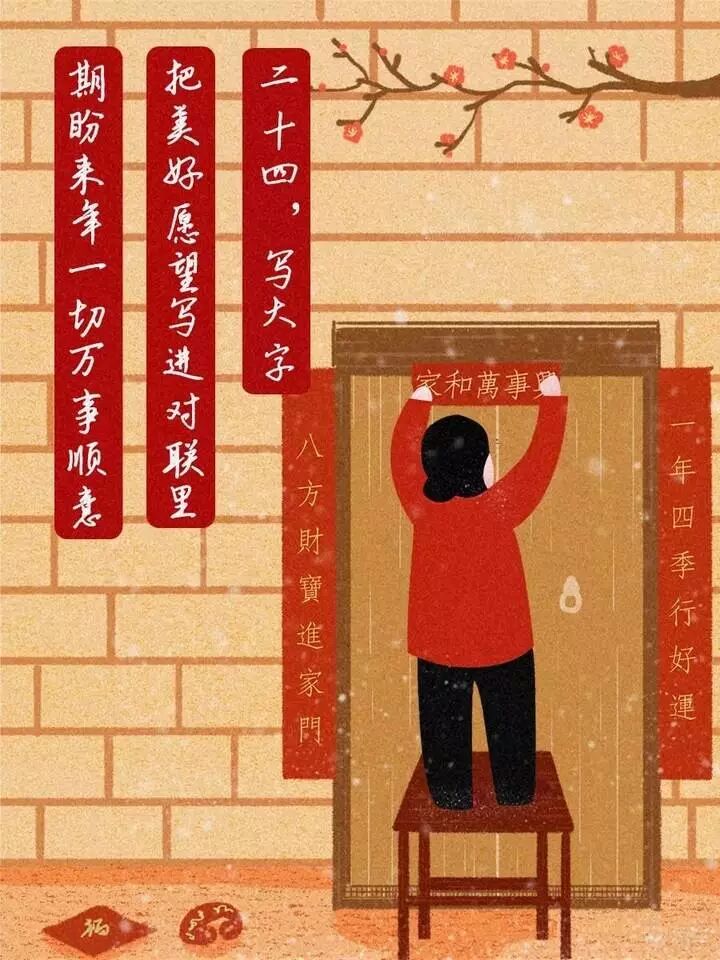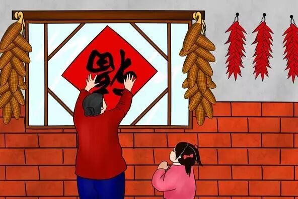 在贴春联的同时,一些人家要在屋门上、墙壁上、门楣上贴上大大小小的“福”字。春节贴“福”字,是我国民间由来已久的风俗。“福”字指福气、福运,寄托了人们对幸福生活的向往,对美好未来的祝愿。为了更充分地体现这种向往和祝愿,有的人干脆将“福”字倒过来贴,表示“幸福已到”“福气已到”。中国民间还有将“福”字精描细做成各种图案的,图案有寿星、寿桃、鲤鱼跳龙门、五谷丰登、龙凤呈祥等。