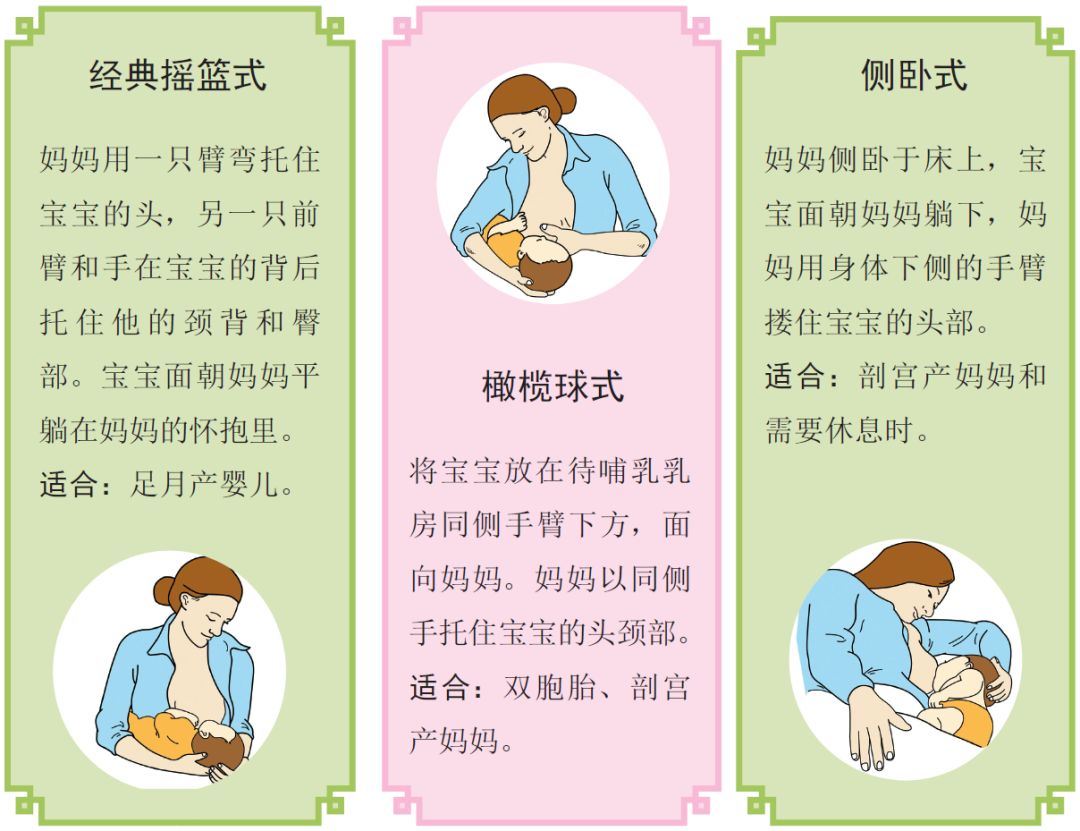 比较常见的母乳喂养姿势包括经典摇篮式、橄榄球式和侧卧式,妈妈可以依据宝宝和自身的情况选择适合的喂养姿势。