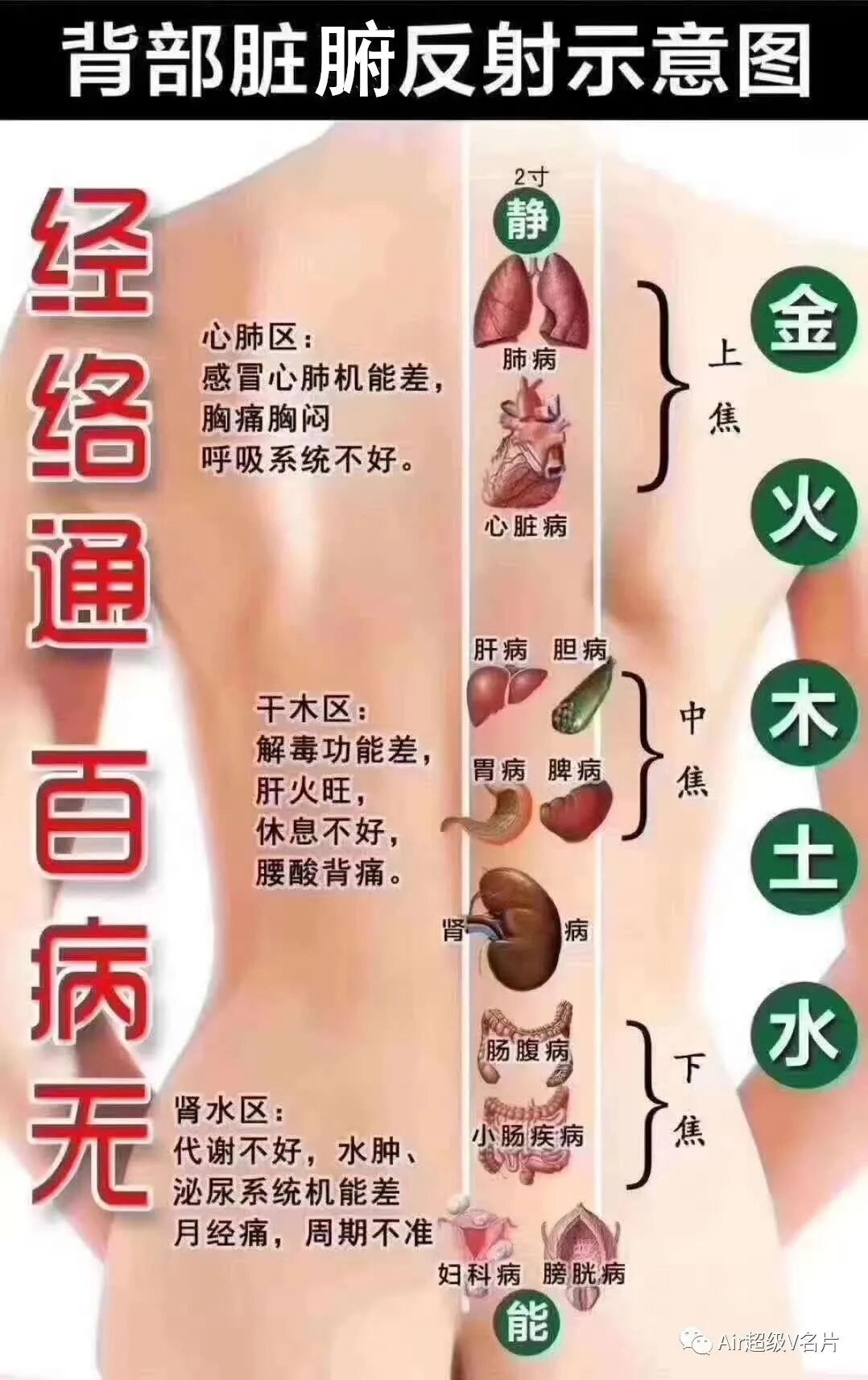 背部是以脊椎为中心的整个人体的全息缩影,是人体五脏六腑最直接的反应区,人体的五脏六腑均可在背部找到相应的对应区,如: