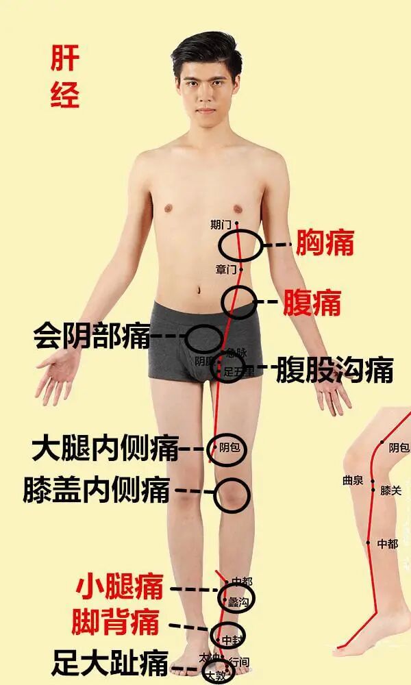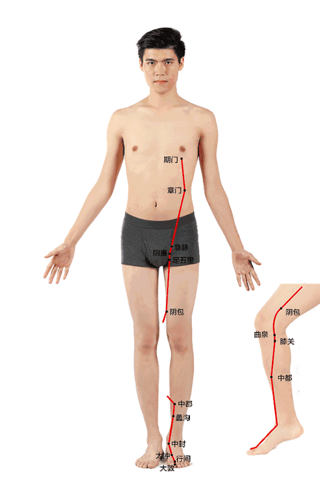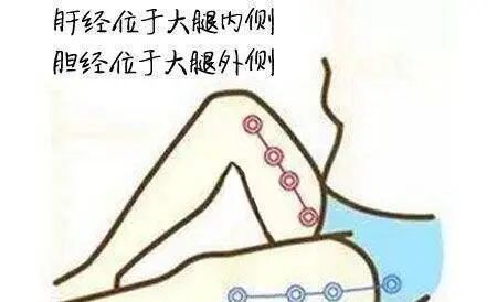 【位置】:肝经位置和胆经恰恰相反,它在大腿的正内侧,也就是内裤线的位置。