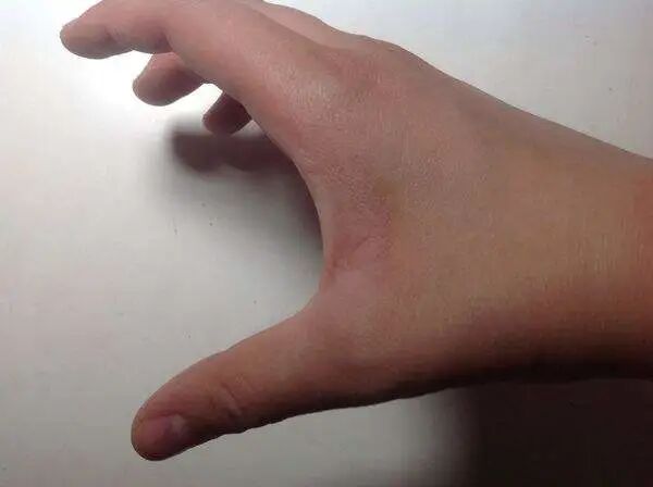 我们的虎口,也就是我们拇指和食指指根的中间点。这个位置一般是粉红色、红润的。在手掌的反射区里面,虎口对应的这里就是肝区,如果这里发青的话,一般代表肝气不通,是肝火肝郁的表现。