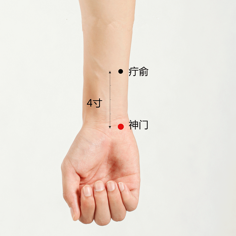 说明:神门穴位置很深,需用大拇指的指节内侧用力掐按才能达到一定刺激量,产生效果。