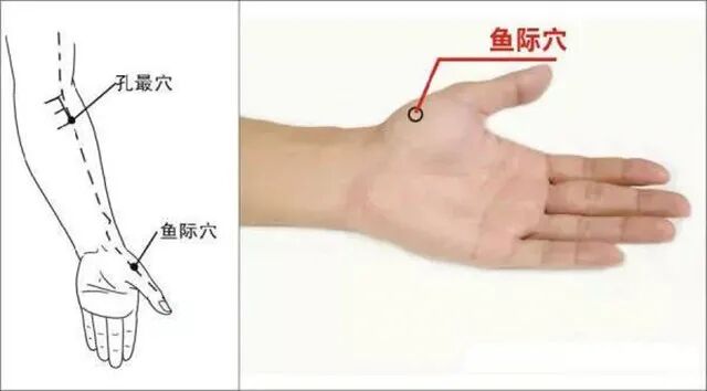 点揉“鱼际穴”、“鱼际穴”在靠近大拇指的两骨中间位置,按揉时,拇指要靠向第 一掌骨发力,肺有疾时此处也会痛感明显,可是有人开始时痛感不重,当把“孔最穴”疏通之后,感觉才会出现。