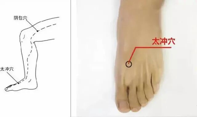 2、“太冲穴”在大脚趾与二脚趾分叉处的凹陷中,用食指向脚踝方向勾住此处然后点揉,如果有痛点需要疏理。