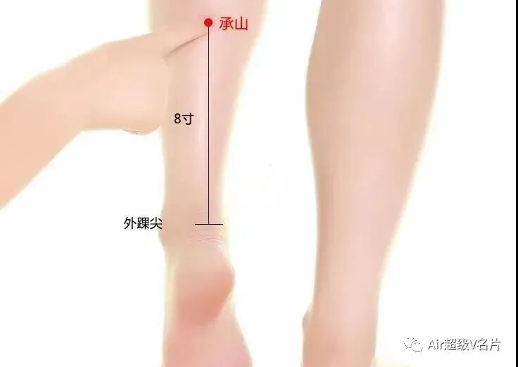 承山穴在小腿肚子下缘,找的时候,要把脚后跟翘起来,这样,小腿肚子就形成一个窝儿,这个穴位就在这个窝儿里。