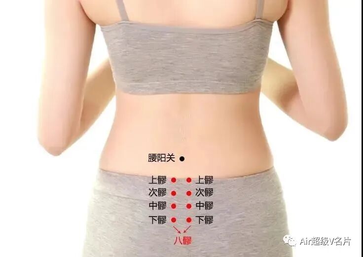 腰部往下还有好多髎,上髎、次髎、中髎、下髎,左边4个,右边4个,共8个,通常叫八髎,主要在裤腰的下缘和尾骨尖中间这一段旁开2-3厘米处。