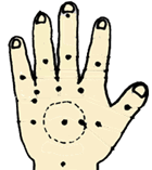手无名指腹.两支手都有,都要按摩.从手指近端向远端推(注意这个穴位到儿童六岁就消失了)