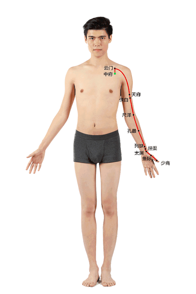 肺手太阴之脉,起于中焦,下络大肠,还循胃口,上膈属肺。从肺系,横出腋下,下循臑内行少、心主之前,下肘中,循臂内上骨下廉,入寸口,上鱼,循鱼际,出大指之端。其支者:从腕后,直出次指内廉,出其端。