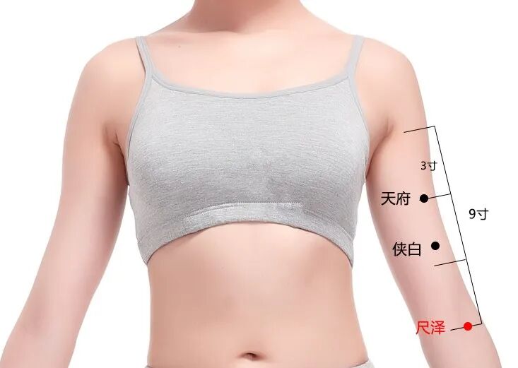 取穴:尺泽穴位于肘部,取穴时,正坐位,仰掌(掌心向上),微屈肘,在肘窝中央有一粗肌腱,肌腱的外侧即是此穴。