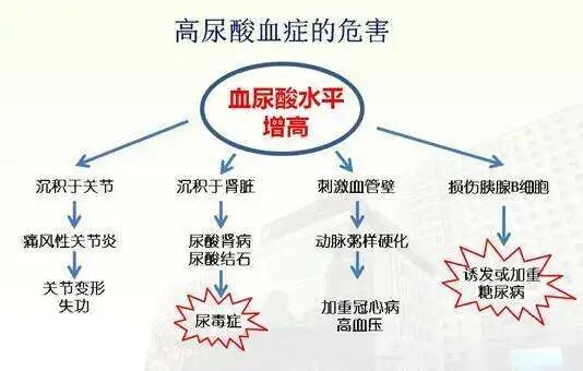 尿酸沉积在肾脏会引起肾脏损害,甚至诱发肾功能衰竭;沉积在尿路,引起尿路结石;除此之外,尿酸高还会增加高血压、心血管疾病、糖尿病等的患病几率。