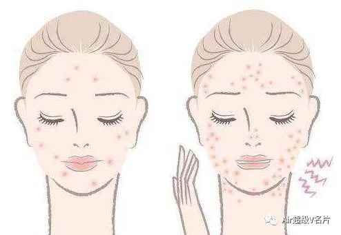 颜面及两颊散在潮红色米粒大小的丘疹,皮疹以口鼻周围及两眉间居多,面部常有毛细血管扩张,情绪激动或遇热时面部明显潮红,有灼热感,妇女在月经前后皮疹增多,大便干燥,小便黄赤,舌尖红苔薄,脉细滑数。