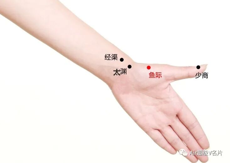 找穴:第一掌骨、赤白肉际的中点就是鱼际穴。