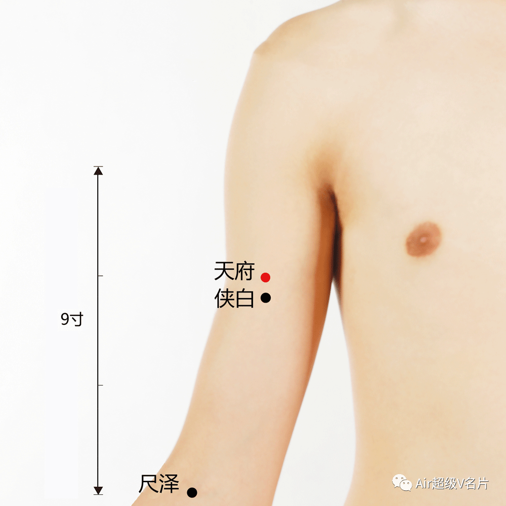 天府穴往下一大拇指宽度的地方就是侠白穴。“侠白”就是有个侠客在保护肺,给我们补足肺气,让我们无所畏惧。所以它可以调理肺气不足造成的经常恐惧、心跳过速。