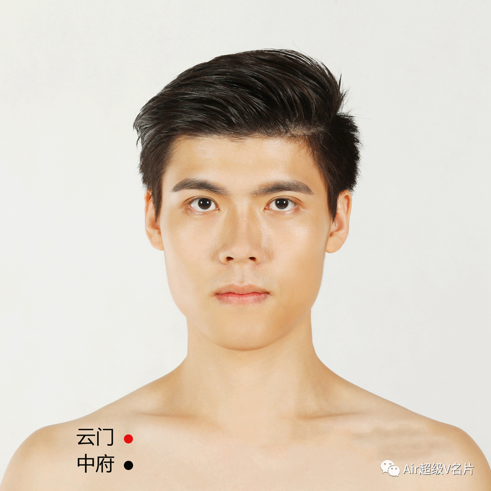 推的时候,大拇指按着中府穴,然后向上推云门穴,一般这里会很痛。把痛的地方给推开,浊气就会散掉,你就会觉得胸里面非常舒服。