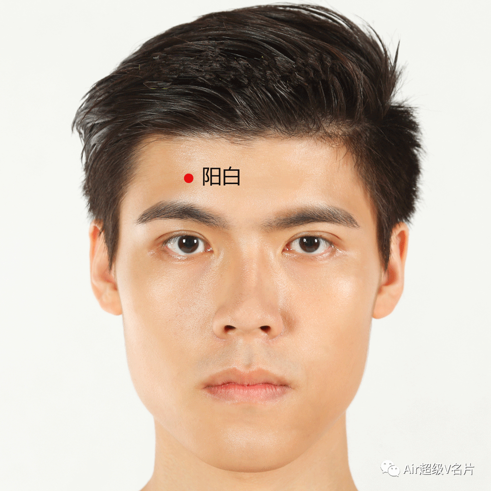 阳白穴位于眉毛的中间往上一寸(即一个大拇指的横指位置)。与丝竹空穴一样,阳白穴的按摩方法也是用双手食指(或中指)按压,每次按100~200次,每天可以重复按多次。
