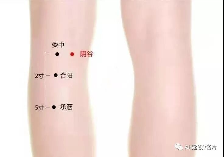 阴谷穴在腘窝内侧,屈膝时,当半腱肌肌腱与半膜肌肌腱之间。(此穴为双穴,左右各一)