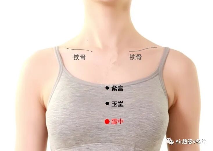 膻中穴位于人体的胸部人体正中线上,两乳头之间连线的中点。